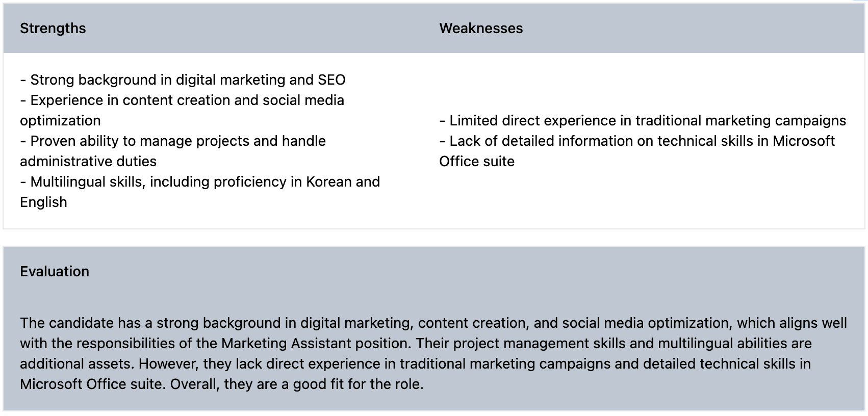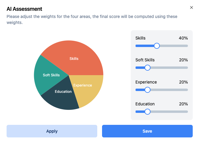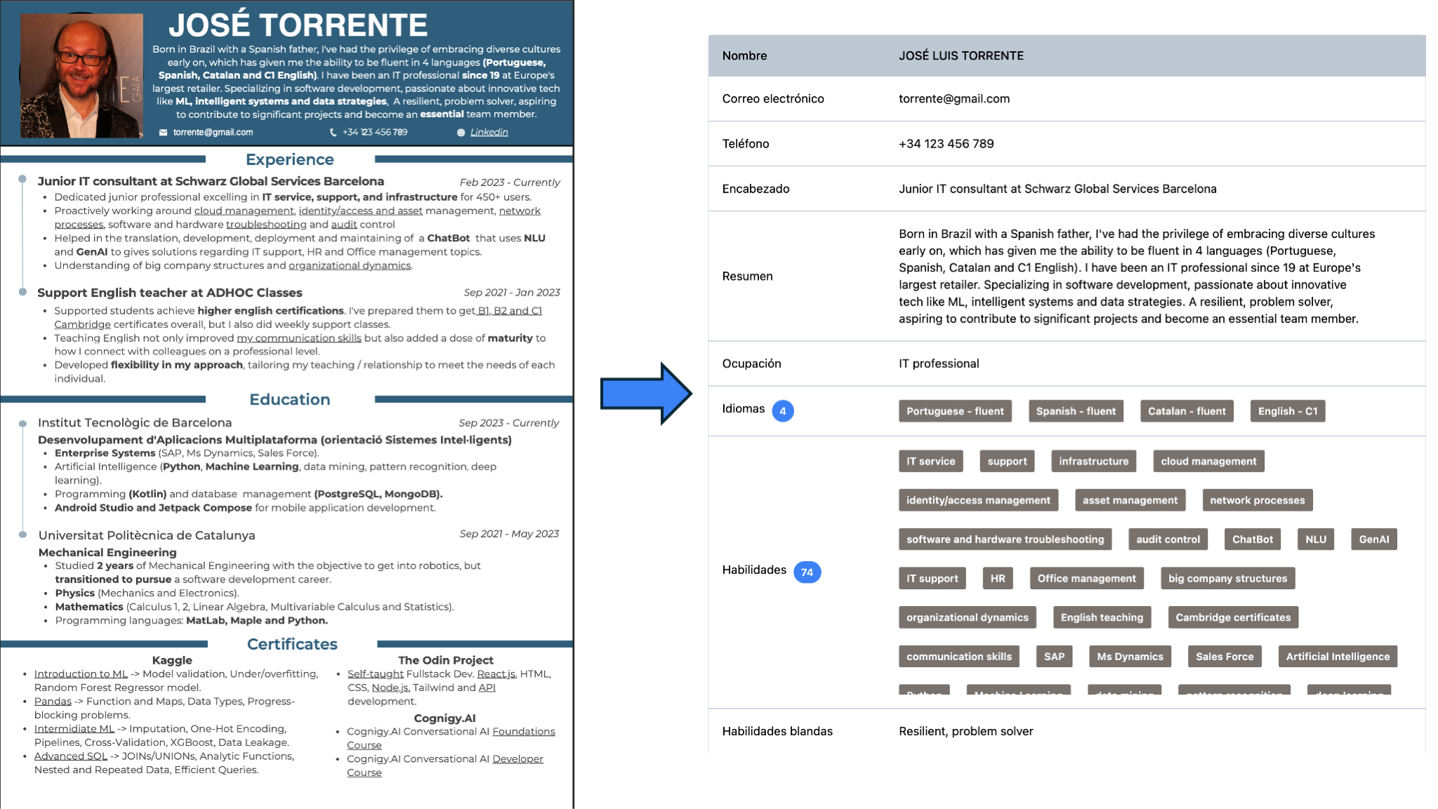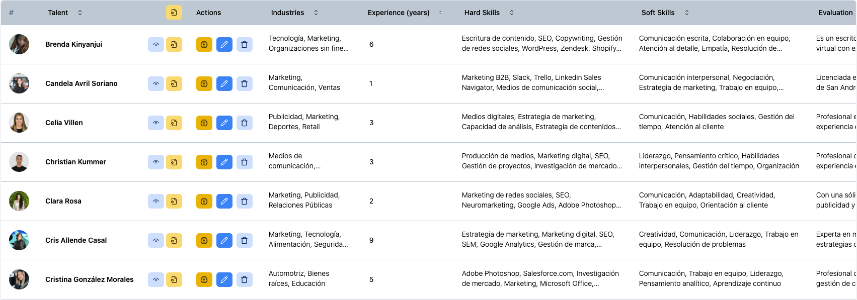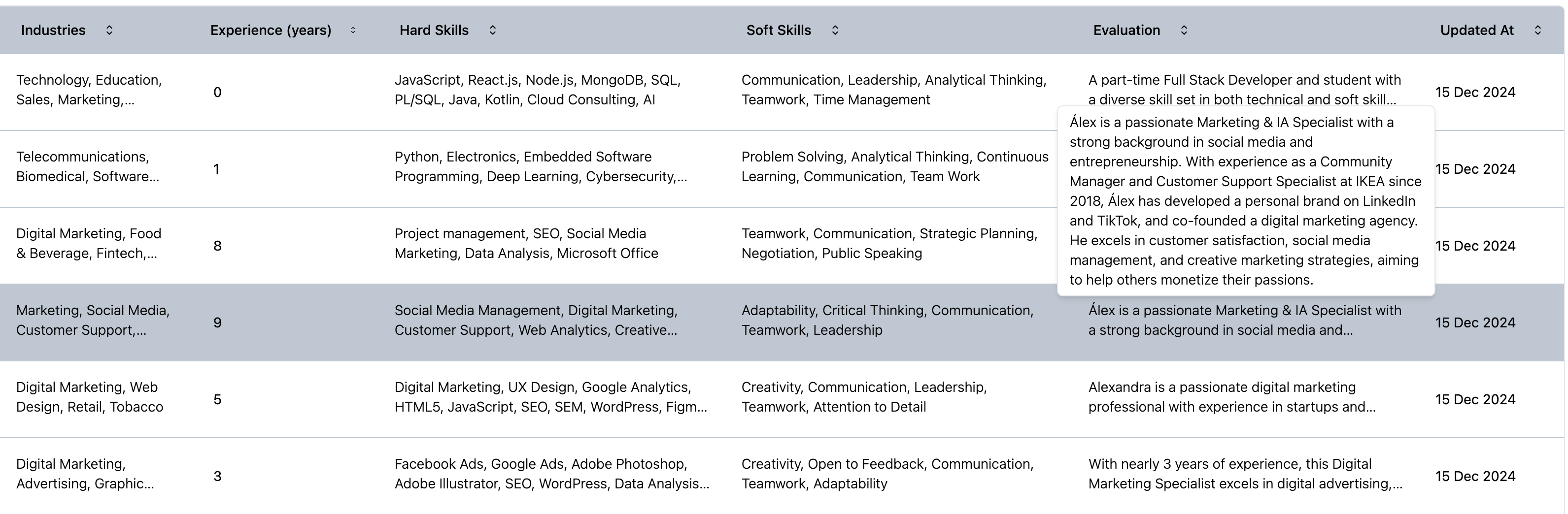 Talent AI analiza automáticamente los CVs y extrae información clave como experiencia, habilidades y formación. Luego compara cada candidato con los requisitos del puesto y proporciona una puntuación detallada basada en criterios personalizables.