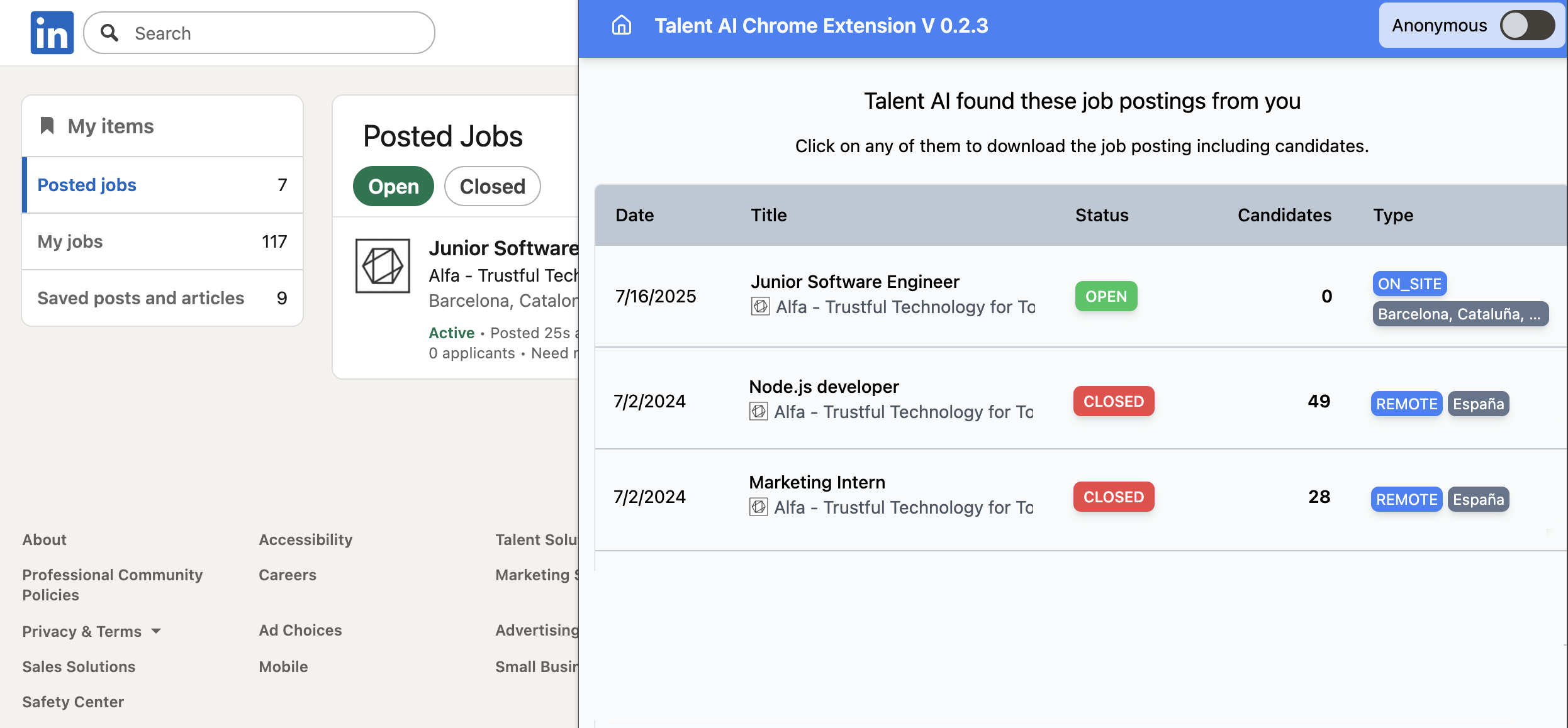 Talent AI es una plataforma de reclutamiento impulsada por inteligencia artificial que automatiza y optimiza todo el proceso de selección de candidatos. Desde la importación de CVs hasta la evaluación de candidatos y la generación de preguntas de entrevista.
